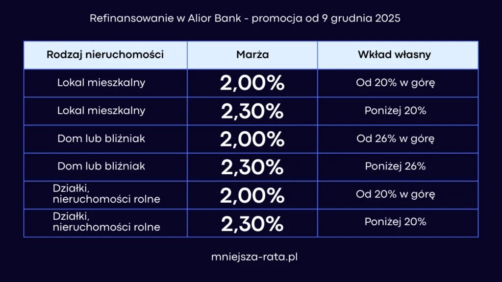 Od 9 grudnia 2025 Alior Bank wprowadził promocyjną ofertę refinansowania. Marża w wysokości 2% nie powala na łopatki, ale oferta wciąż jest warta uwagi. Prowizja 0% a przede wszystkim bardzo prosty cross-sell, bez dodatkowych ubezpieczeń. Dla części osób, jest to warta rozpatrzenia oferta refinansowania. Poziom oprocentowania stałego w dniu startu promocji w Alior Bank 5,87%.