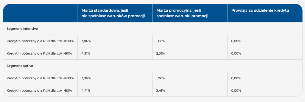 W tej ofercie koszt marży to 1,96% dla kredytów z wkładem wyższym i 2,41% dla kredytów z wkładem niższym.
