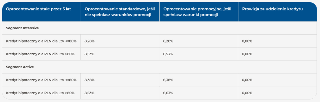 Wariant Intensive pozwala na uzyskanie niższego oprocentowania w zamian za spełnienie warunków dodatkowych. Jeśli nasz wkład własny wynosi co najmniej 20%, oprocentowanie wyniesie 6,28%. W przypadku wkładu poniżej 20% będzie to 6,53%.