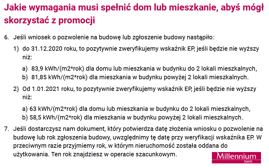Zanim przejdę do przedstawienia ubezpieczenia związanego z obniżką marży w Millennium, jeszcze ostatnia promocja. Tym razem związana nie związana z produktami dodatkowymi a z energooszczędnością naszej nieruchomości, czyli promocja eko. To, czy nasze mieszkanie czy dom się załapią rozstrzyga zgodność wskaźnika EP z określonymi normami.