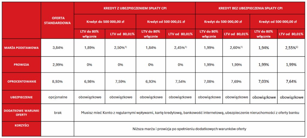 • konto z comiesięcznymi wpływami na kwotę min. 3000 zł – obniża marże o 1.5 p.p.
