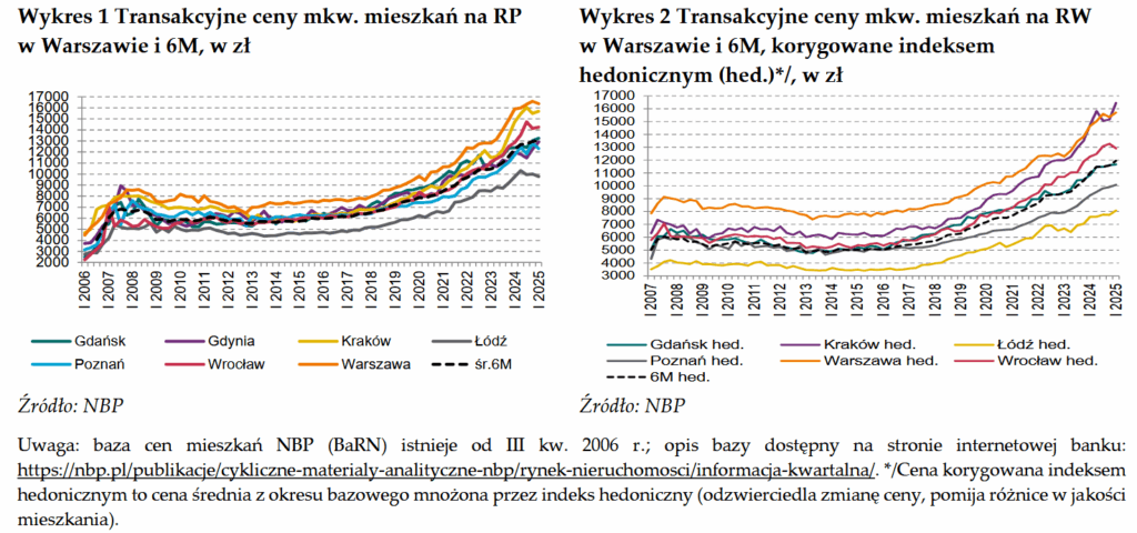 W Warszawie na początku 2020 roku średnia cena mieszkań, zarówno na rynku pierwotnym jak i rynku wtórnym, sytuowała się w okolicach 10 tys. zł/m², natomiast w 2025 jest to już ponad 15 tys. (rynek wtórny) czy 16 tys. zł za metr kw. na rynku pierwotnym. Oznacza to wzrost cen mieszkań w Warszawie o 50% i 60% zależnie od rynku na przestrzeni 5 ostatnich lat. Zwróćmy uwagę, że na wykresie bardzo podobnie wygląda to także dla miast takich jak Kraków, Poznań, Wrocław, Gdynia, Gdańsk czy Łódź.